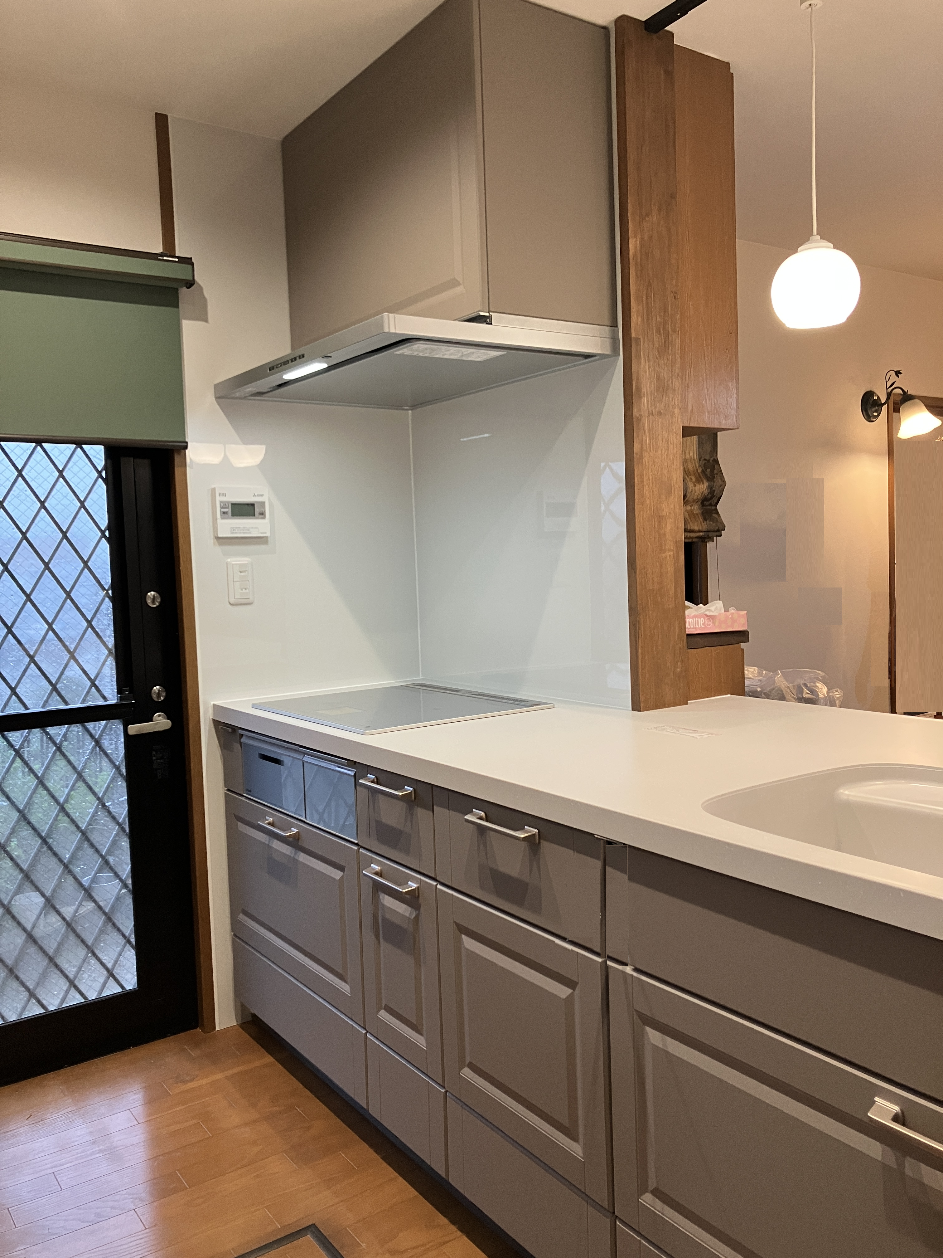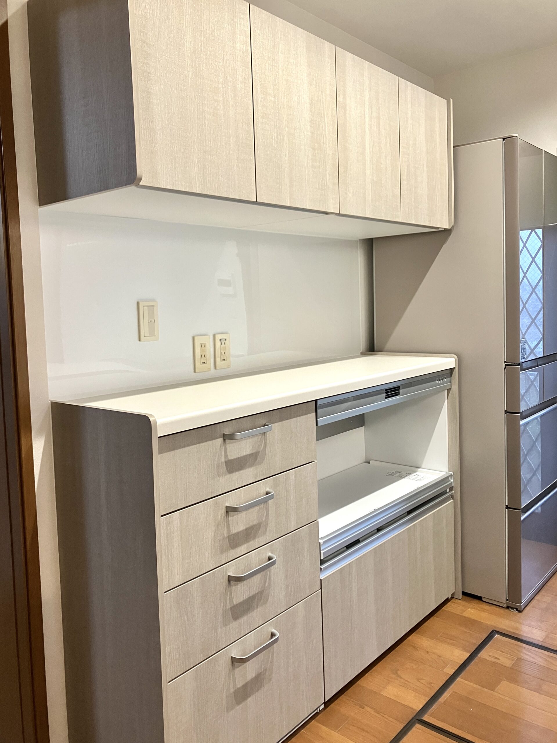 リクシルのリシェルを設置しました。人大ワークトップは明るめを選ばれ、全体的に明るいキッチンになりました。