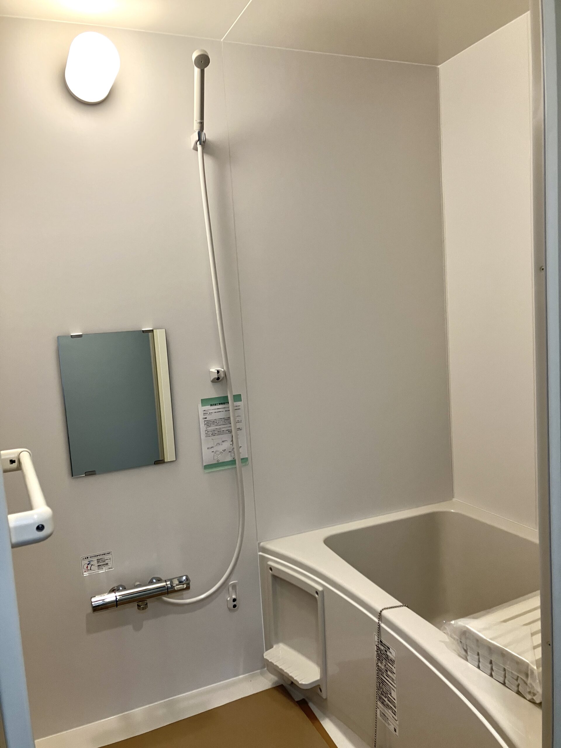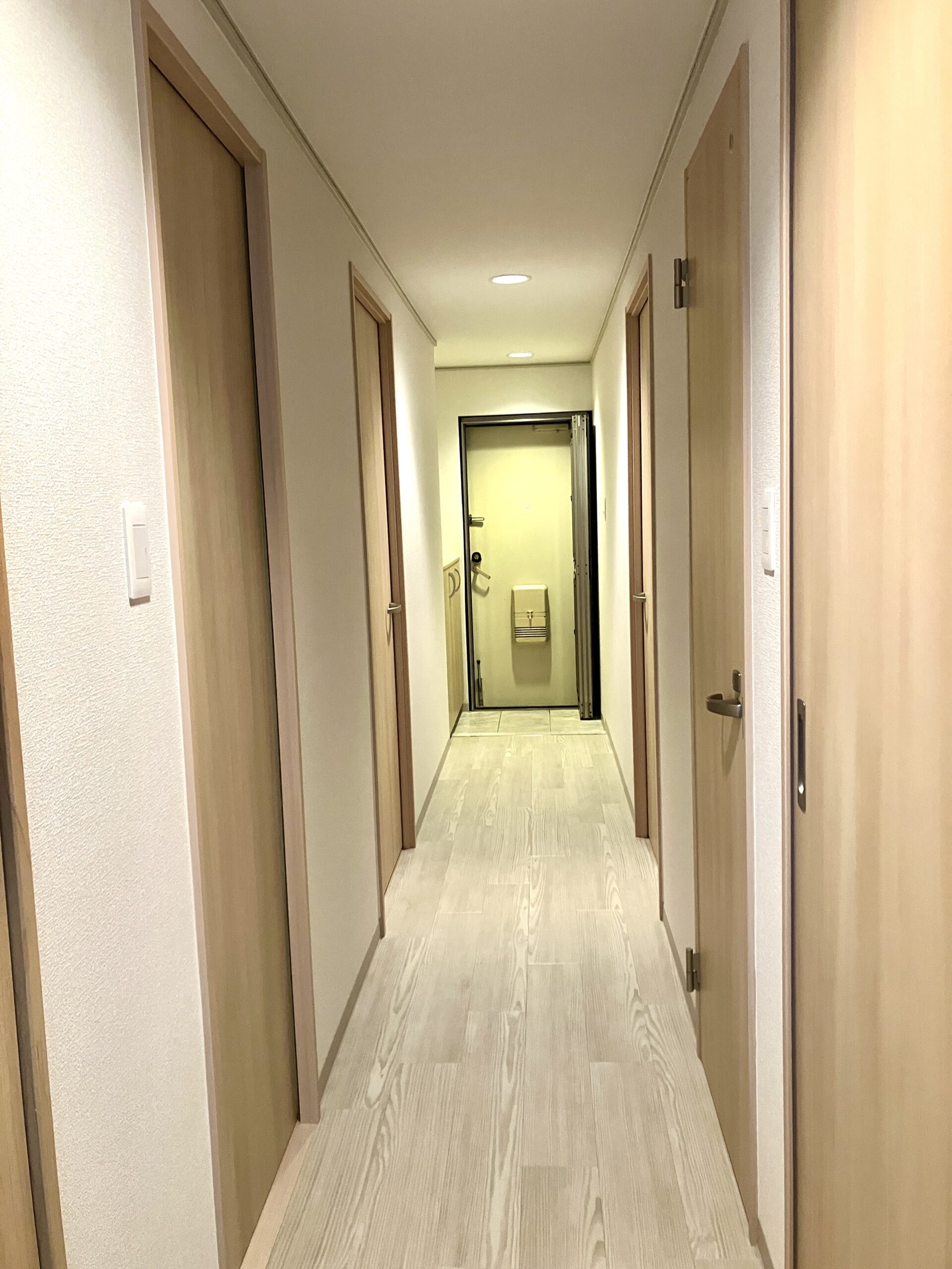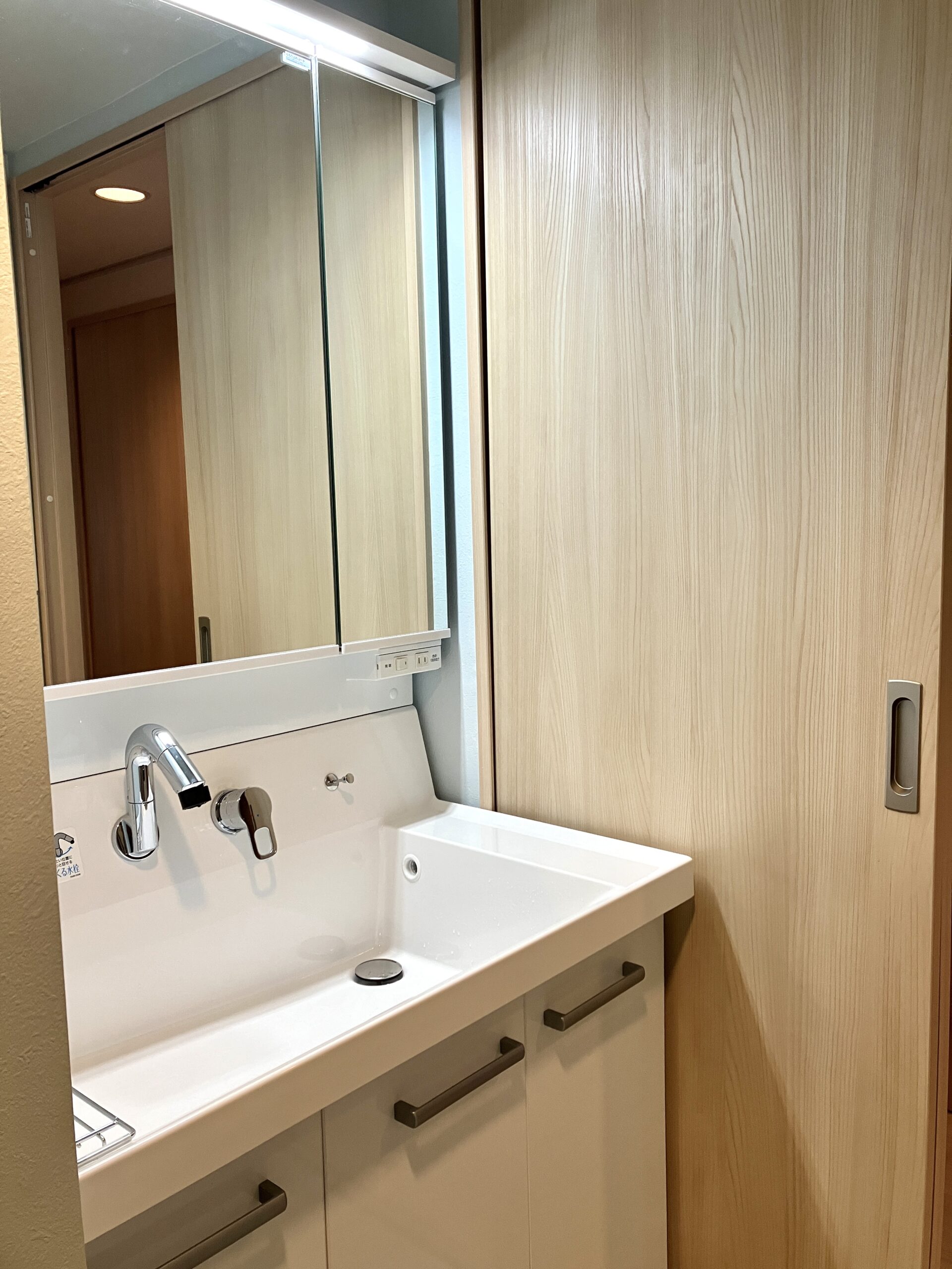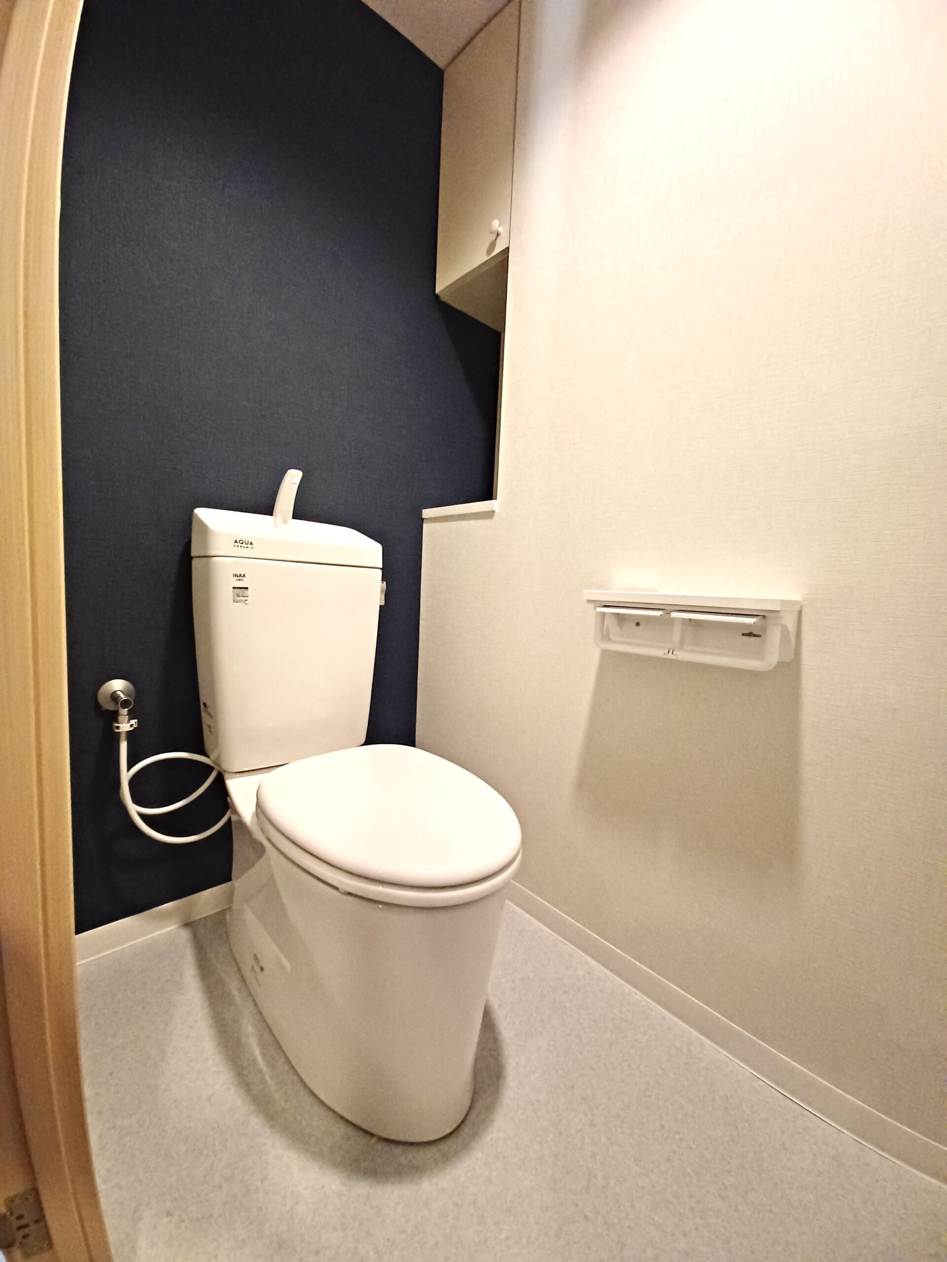 水回りもすべて交換しました。トイレには壁に手洗い器がありましたが古いので取り外しました。アクセントにブルーのクロスを入れました。